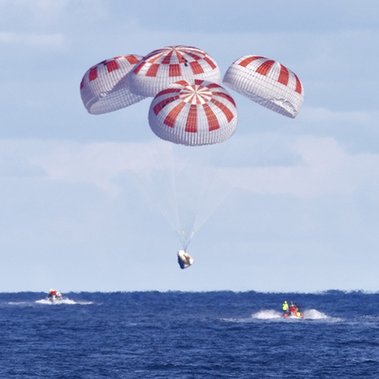 The Dragon spacecraft is equipped with two drogue parachutes to stabilize the spacecraft following reentry and four main parachutes to further decelerate the spacecraft prior to landing.